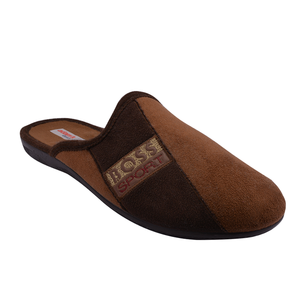 Ανδρική Ισπανική παντόφλα Adams Slippers, σε καφέ χρώμα με σχέδιο Boss. Διαθέτει απαλό, ζεστό ύφασμα και μαλακό πάτημα. Κατασκευασμένη με ενισχυμένο και εύκαμπτο πάτο, καθώς και αντιολισθητική σόλα απο λάστιχο.