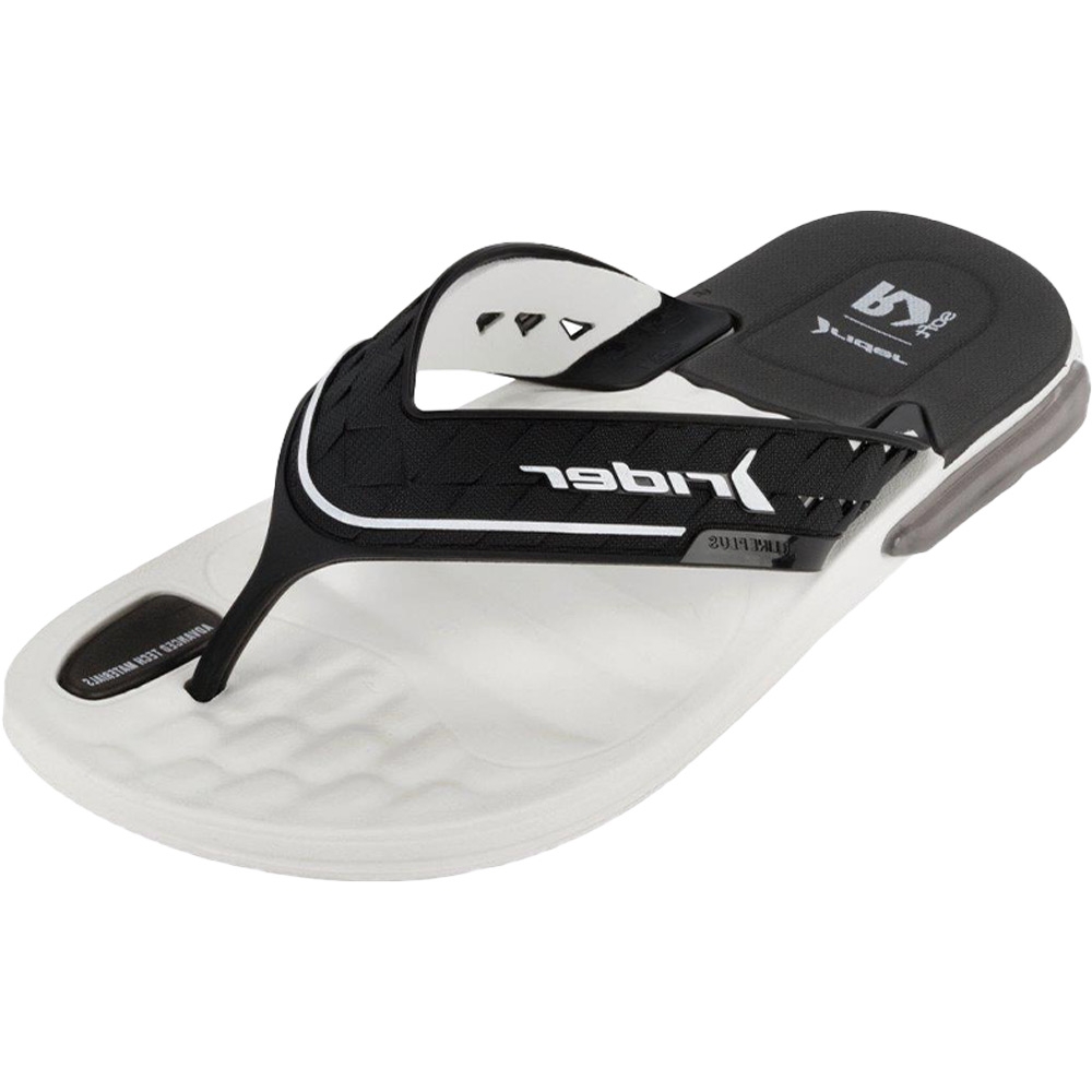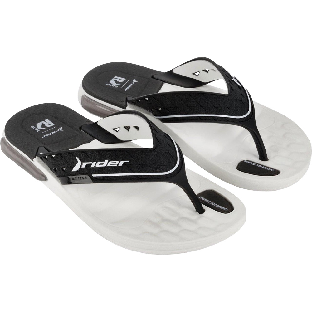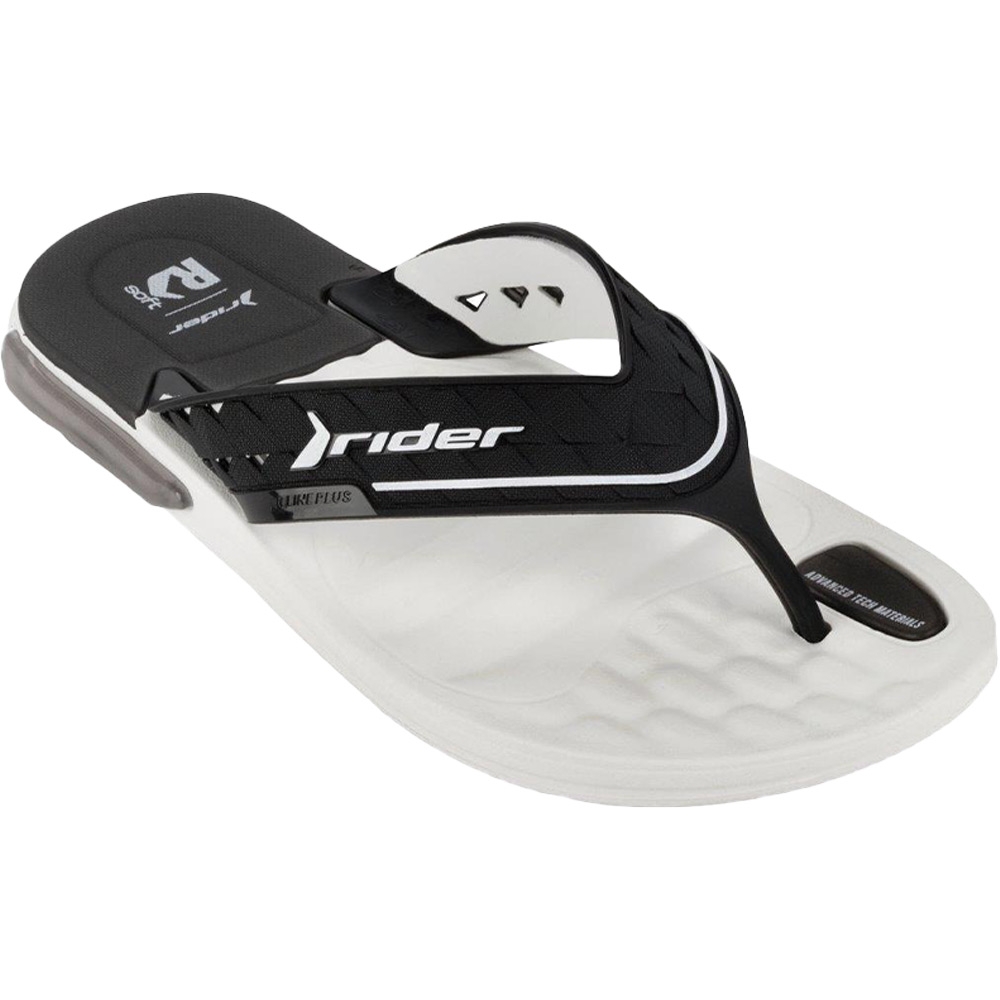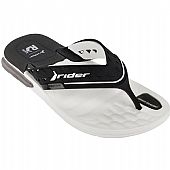 Ανδρική σαγιονάρα Rider, σε λευκό-μαύρο χρώμα. Διαθέτει ανατομική, μαλακή και αντιολισθητική σόλα.
