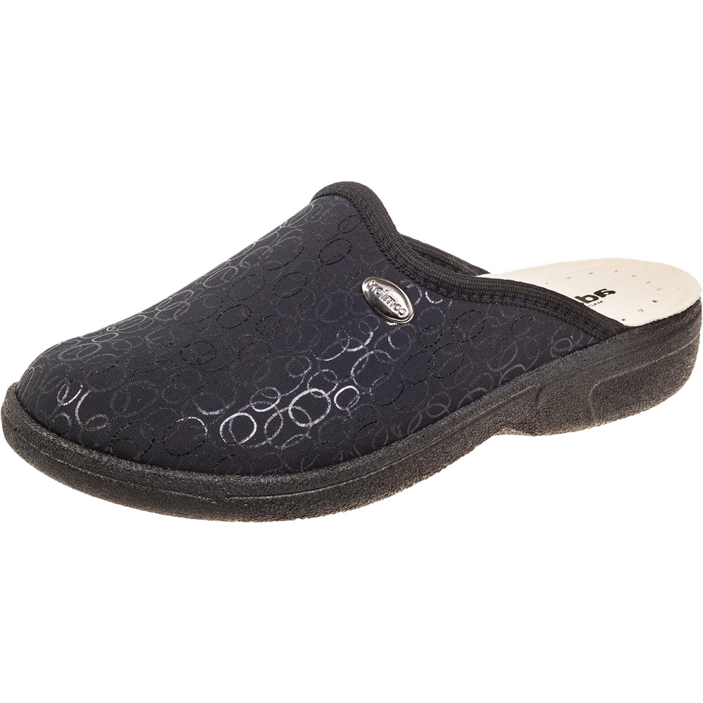 Γυναικεία παντόφλα Adams Shoes, κλειστή σε μαύρο χρώμα. Διαθέτει ελαστικό λουρί, ανατομική και δερμάτινη εσωτερική σόλα και αντιολισθητική εξωτερική σόλα.
