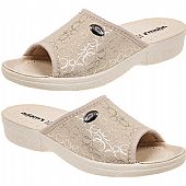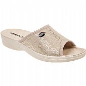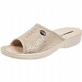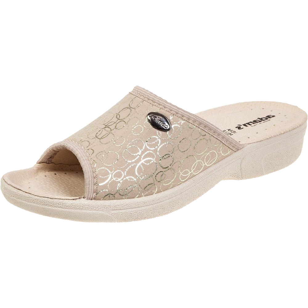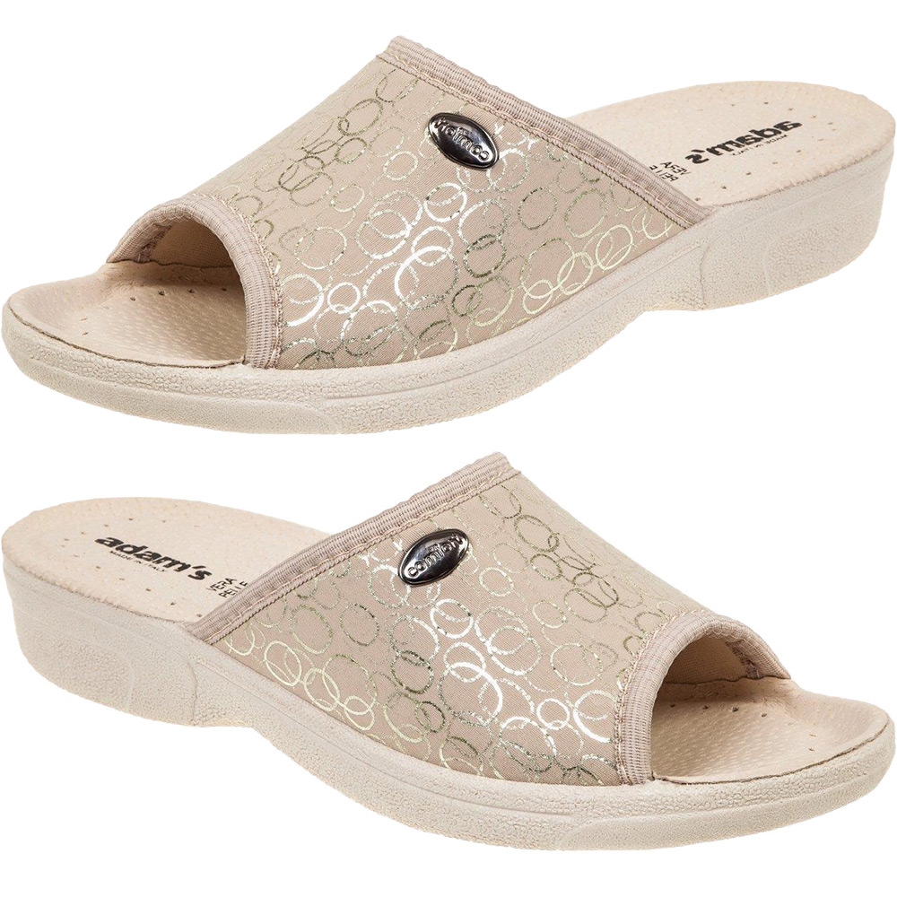 Γυναικεία παντόφλα Adams Shoes, σε μπεζ χρώμα. Διαθέτει ελαστικό λουρί, ανατομική και δερμάτινη εσωτερική σόλα και αντιολισθητική εξωτερική σόλα.