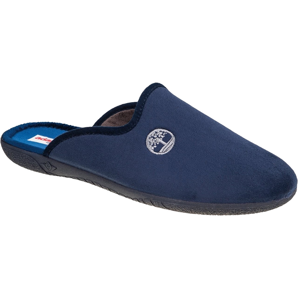 Ανδρική Ισπανική παντόφλα Adams Slippers, σε μπλε χρώμα με σχέδιο Timberland. Διαθέτει απαλό, ζεστό ύφασμα και μαλακό πάτημα. Κατασκευασμένη με ενισχυμένο και εύκαμπτο πάτο, καθώς και αντιολισθητική σόλα απο λάστιχο.
