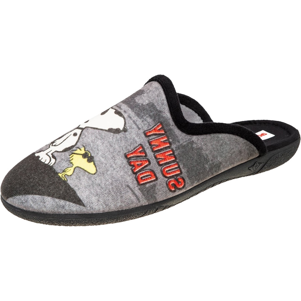 Ανδρική Ισπανική παντόφλα Adams Slippers, σε μαύρο χρώμα με σχέδιο Snoopy. Διαθέτει απαλό, ζεστό ύφασμα και μαλακό πάτημα. Κατασκευασμένη με ενισχυμένο και εύκαμπτο πάτο, καθώς και αντιολισθητική σόλα απο λάστιχο.