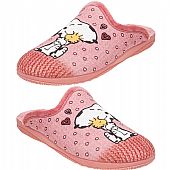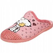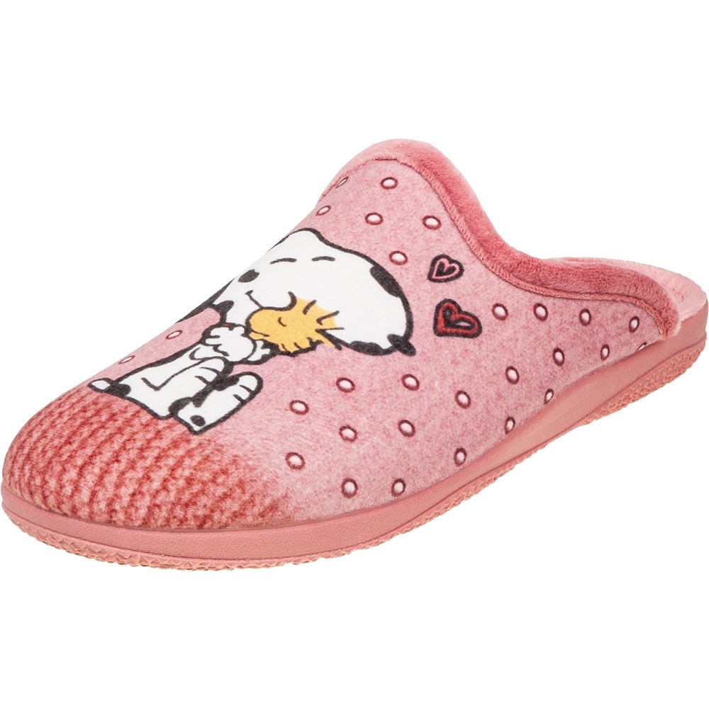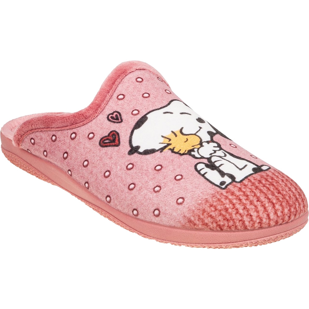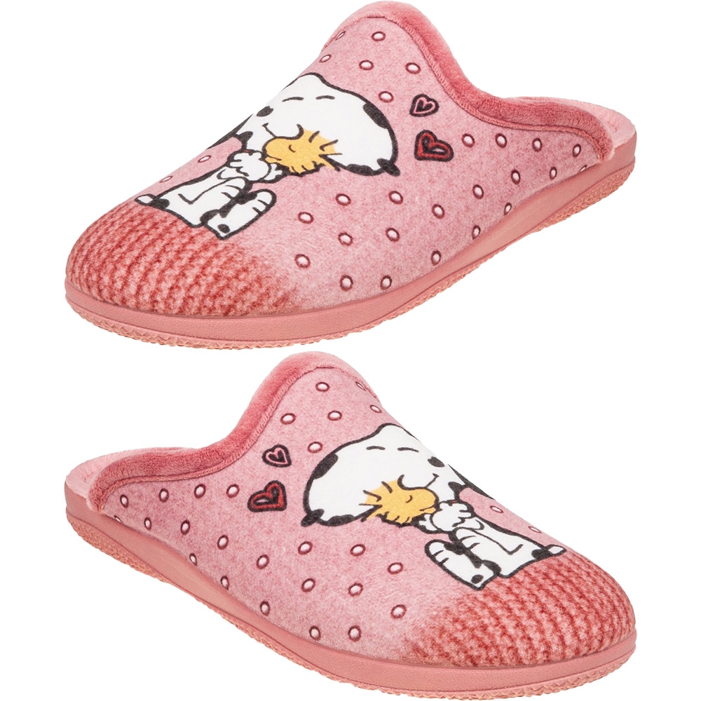 Γυναικεία Ισπανική παντόφλα Adams Slippers, σε ροζ χρώμα με σχέδιο Snoopy. Διαθέτει απαλό, ζεστό ύφασμα και μαλακό πάτημα. Κατασκευασμένη με ενισχυμένο και εύκαμπτο πάτο, καθώς και αντιολισθητική σόλα απο λάστιχο.